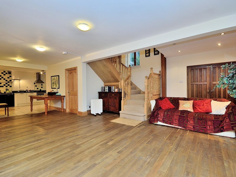 Open-plan kitchen, dining, and lounge area offering hardwood double glazing to ensure plenty of natural light and superb views of Betws and the surrounding Welsh hills