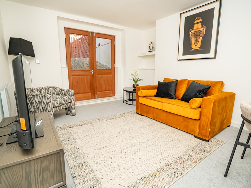 The bright and comfortable lounge features a smart TV, comfy sofa, and free WiFi — perfect for movie nights or working remotely.