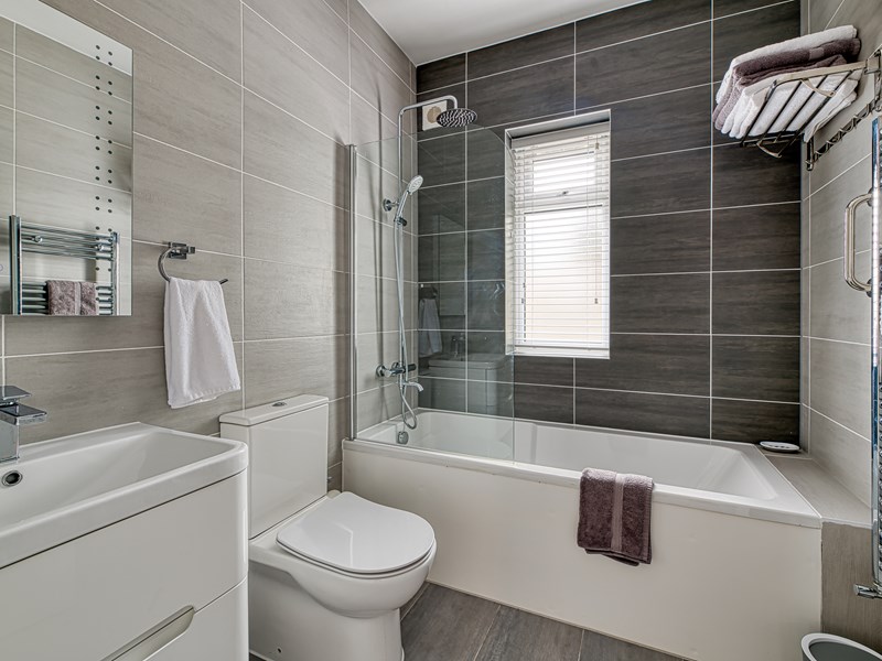 1 Bathroom: Modern with a full-sized bath and shower overhead
