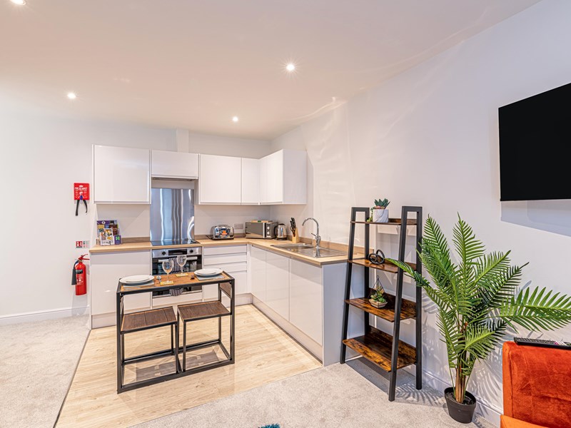 A bright, open-plan kitchen & living room, perfect for cooking, lounging, or catching up on your latest Netflix binge