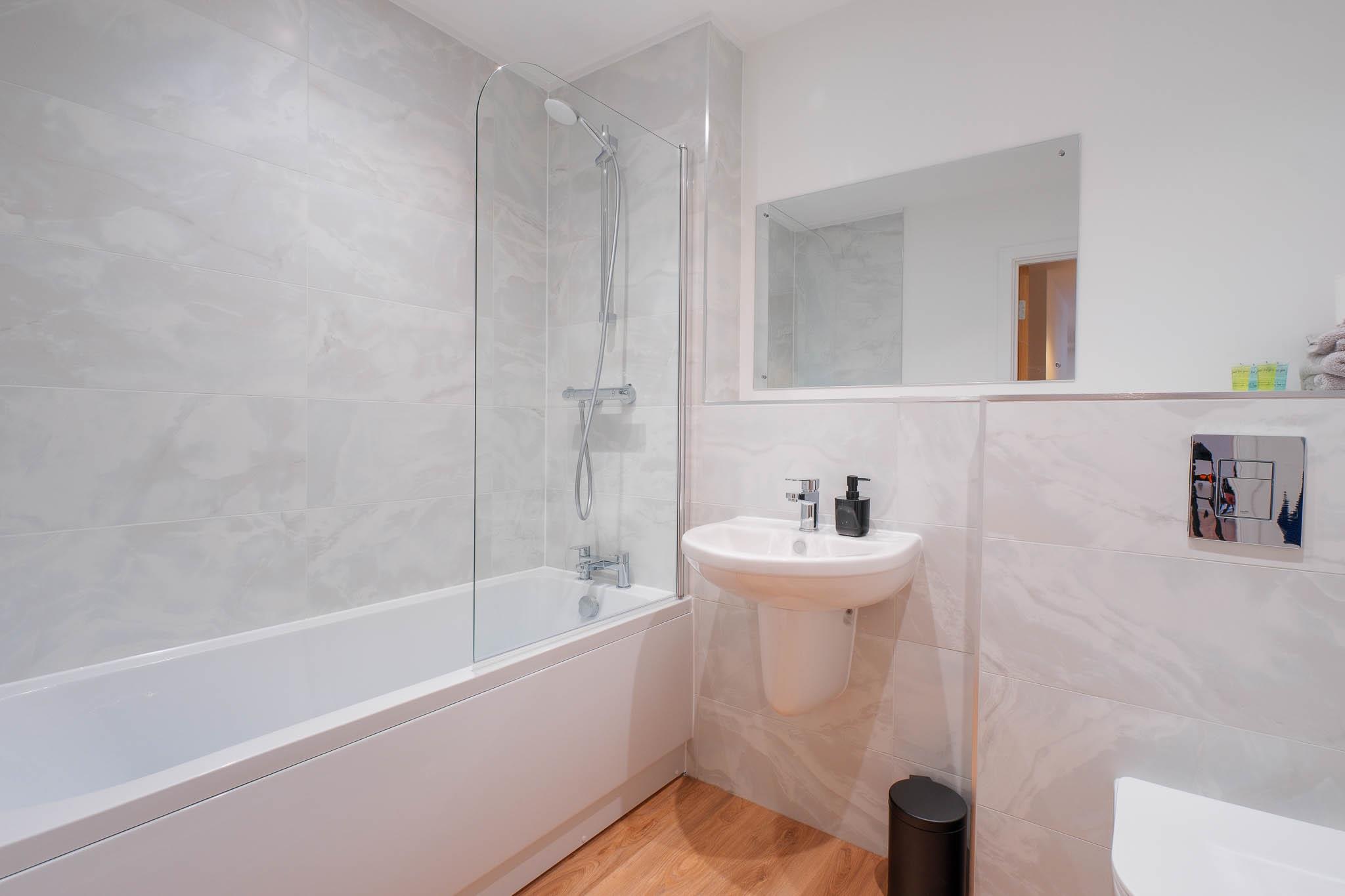 Relax in the stylish bathroom featuring a full-size bath with an overhead shower—perfect for unwinding after a busy day in the city.
