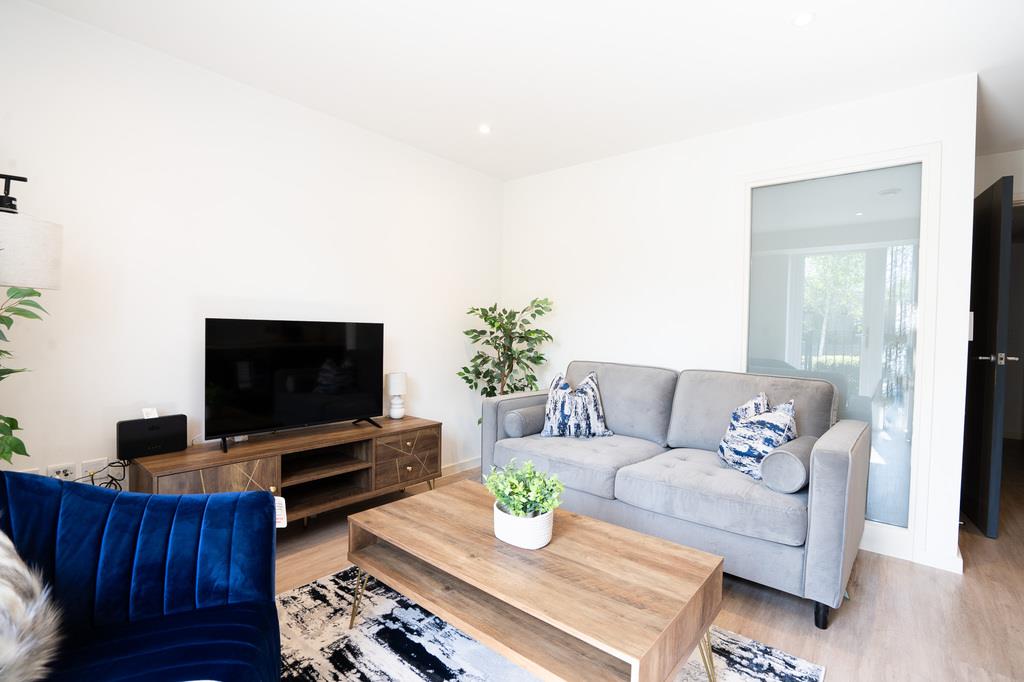 Spacious living room with a smart TV, perfect for relaxing after a day of exploring or work