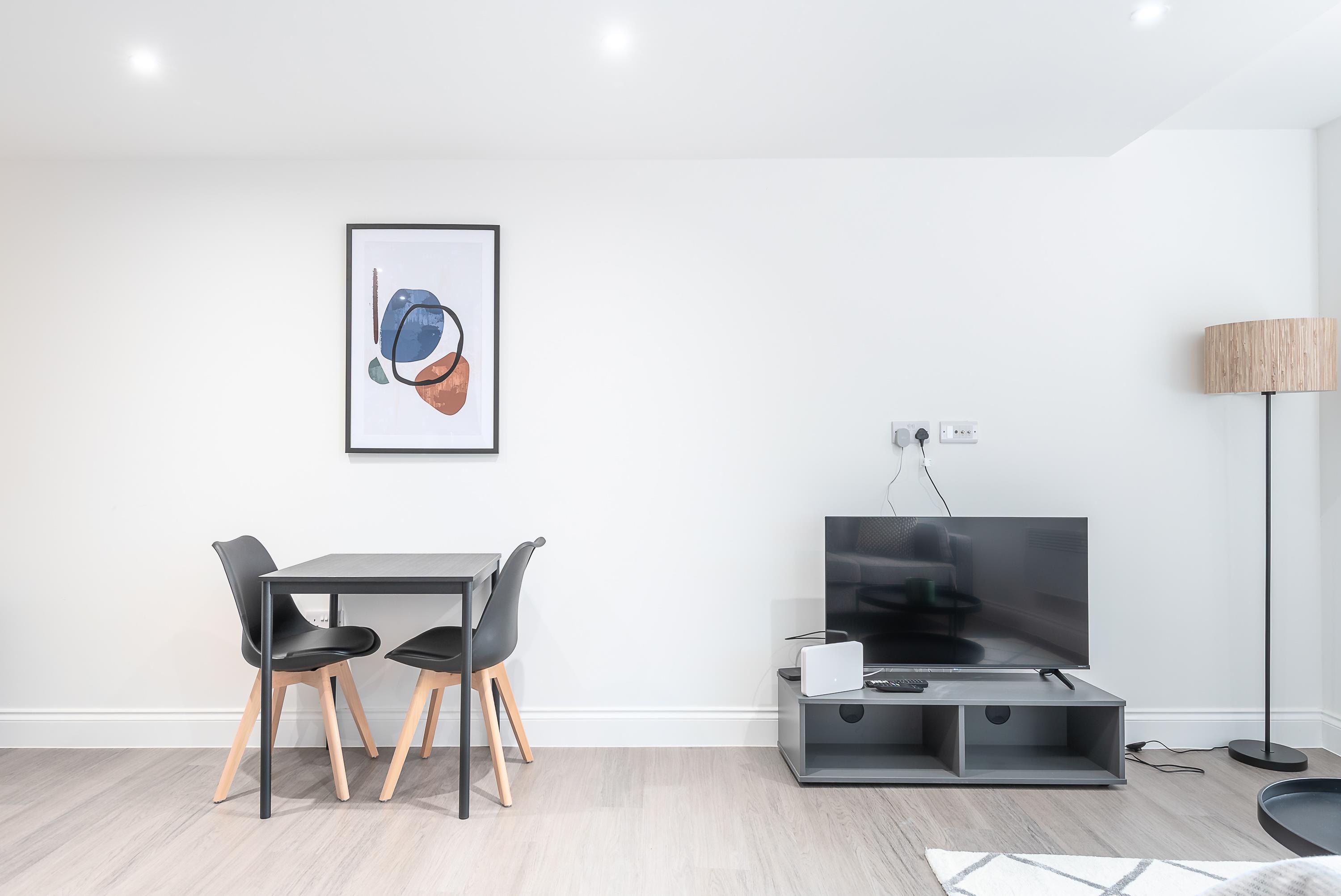 The open-plan living area includes a dining table and TV, perfect for meals, remote work, or winding down with your favourite shows.