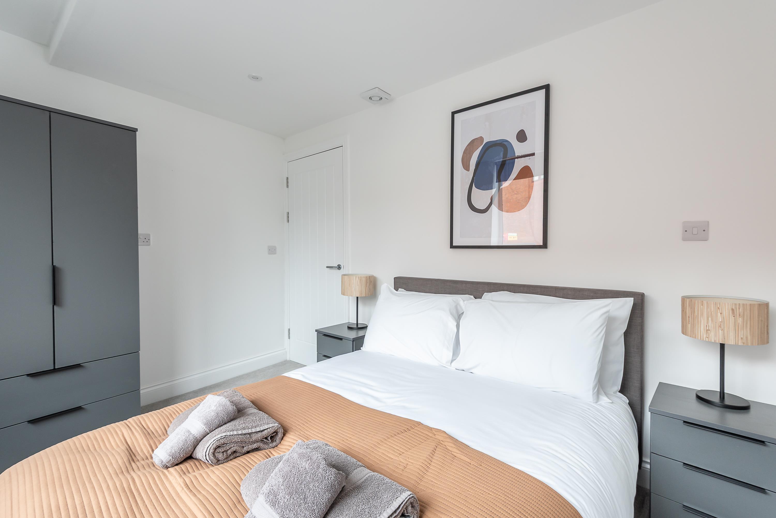 Enjoy a restful night in a stylish double bedroom with soft linens and plenty of storage.