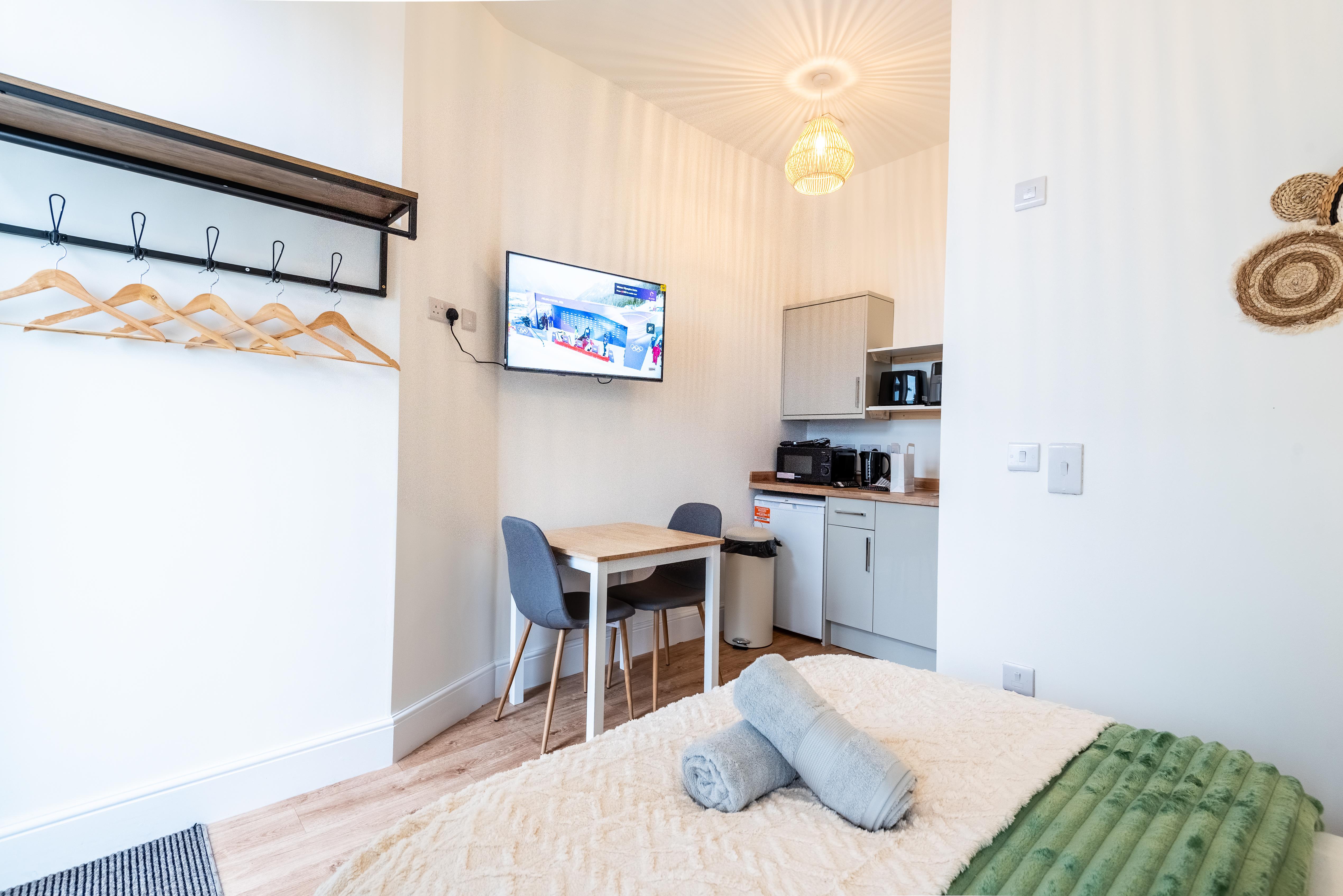 The studio features a well-designed open-plan living and sleeping area, offering a relaxing space to unwind after a day by the sea. A well-equipped kitchenette allows you to prepare light meals with ease, while the contemporary en-suite bathroom provides a clean, modern finish.