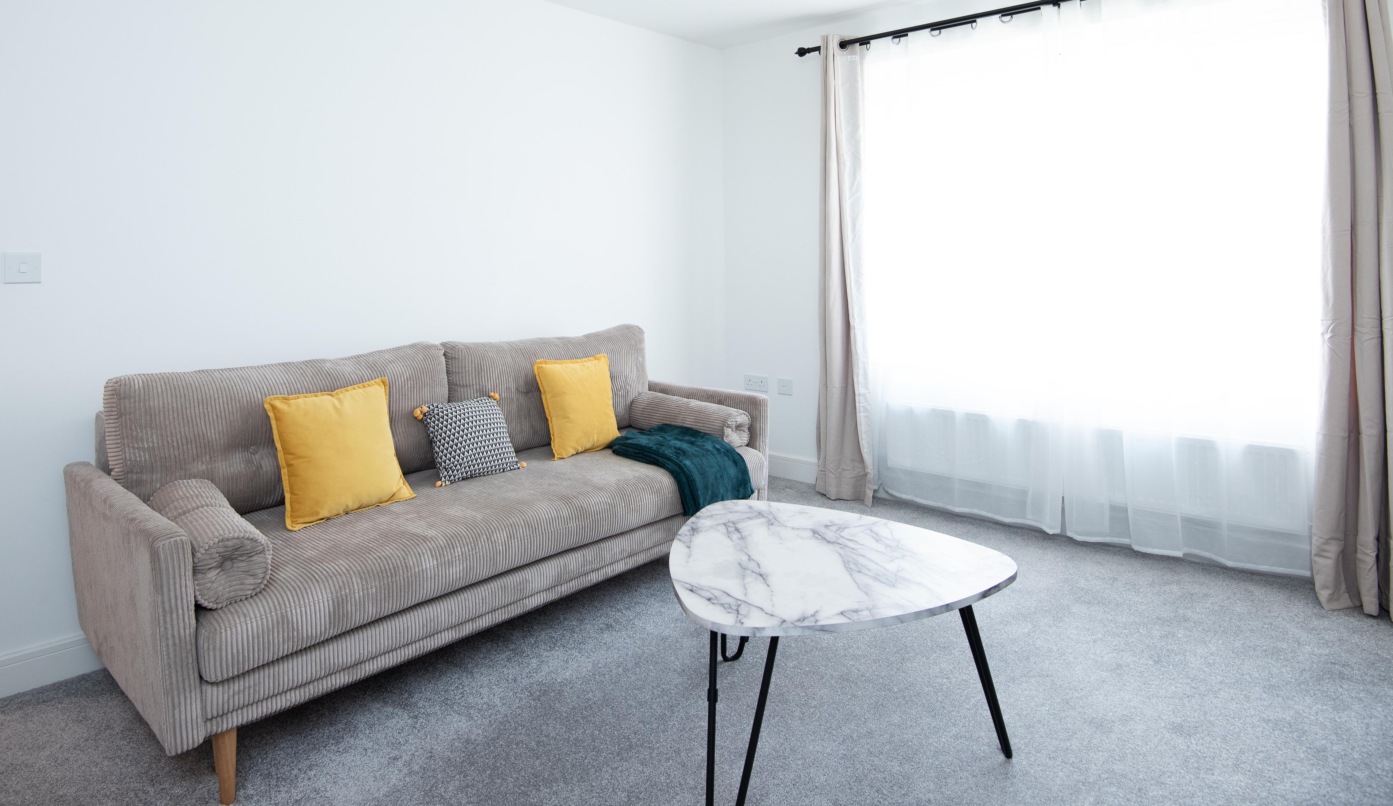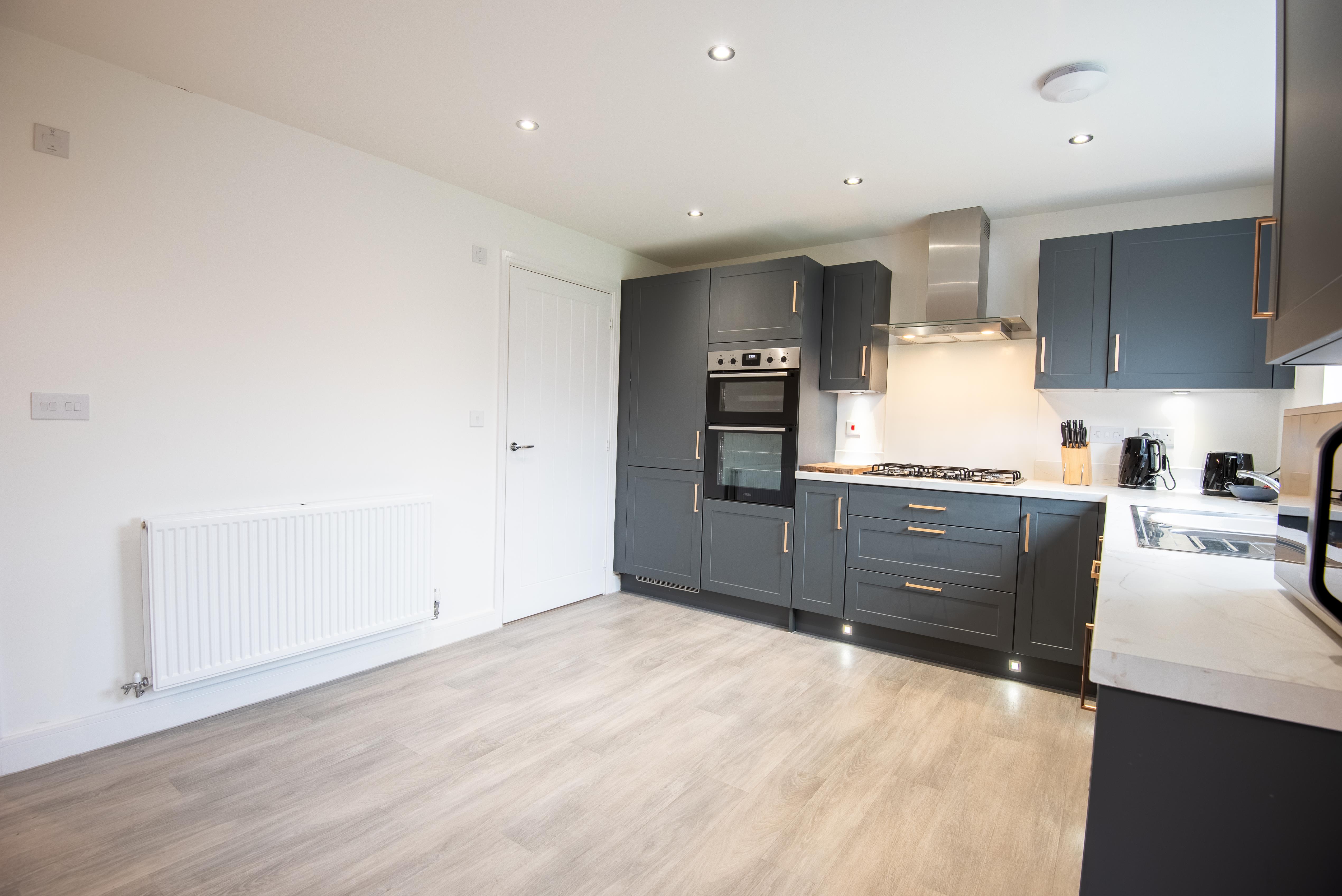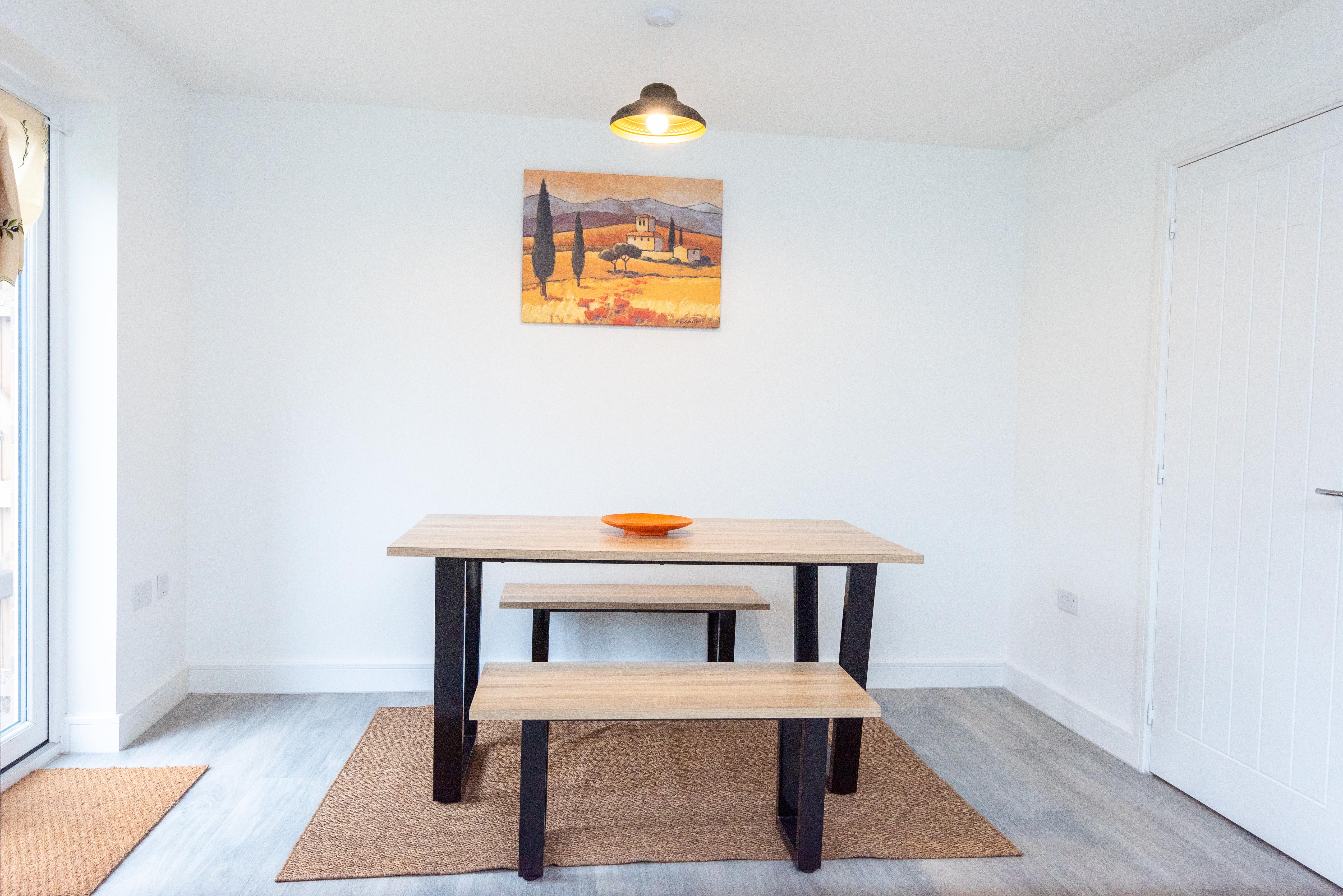 The ground floor features a welcoming living area and a convenient downstairs toilet. The fully equipped kitchen is ideal for short or longer stays and includes an oven and hob, dishwasher, microwave, and a full-size fridge freezer. A dining table seating up to four guests provides the perfect space for meals or remote working. Just off the kitchen, there is a separate laundry room, adding extra practicality during your stay.