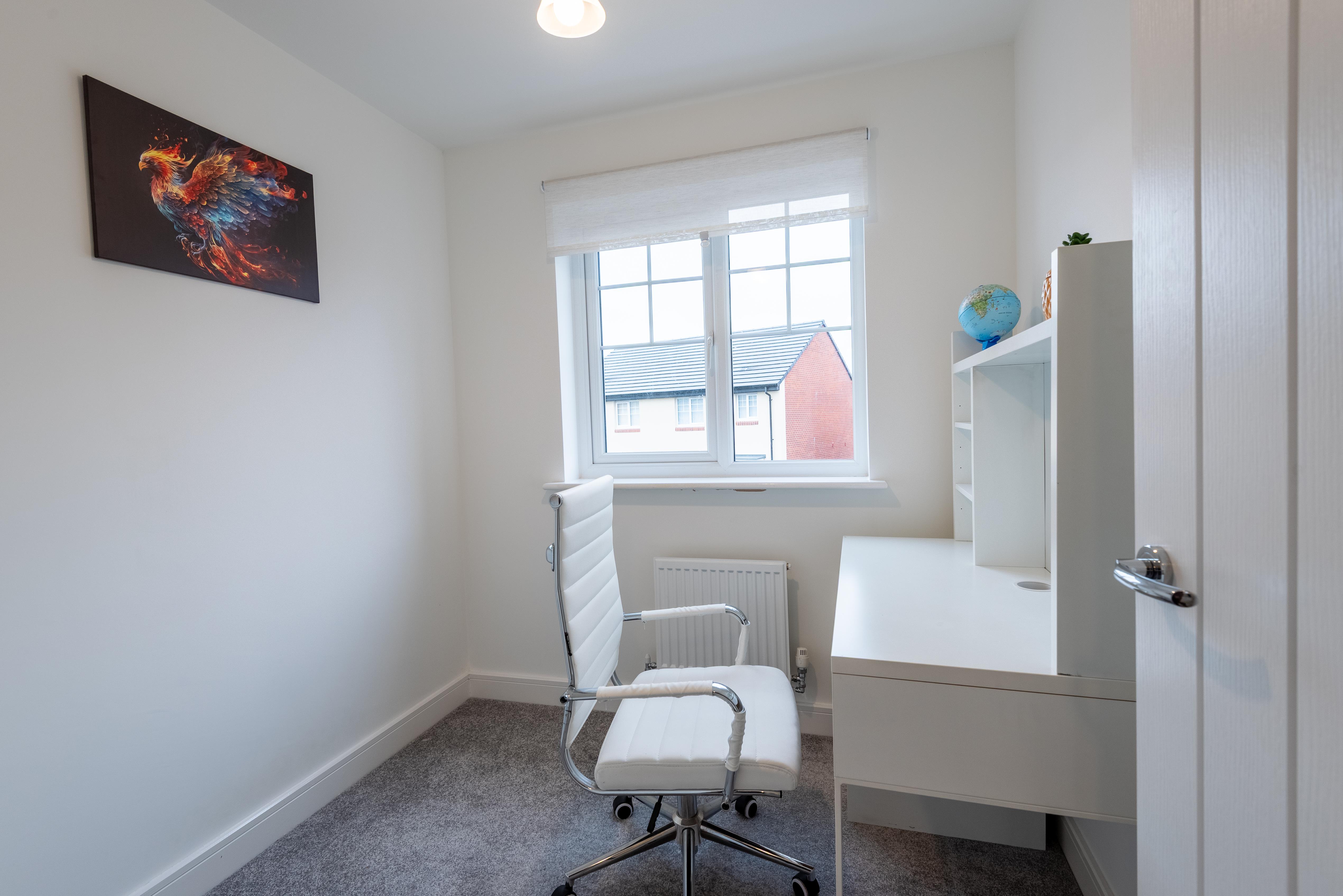 Upstairs, the property benefits from three well-laid-out rooms. The main bedroom features a king-size bed and the added comfort of an en-suite bathroom with a shower. There is also a family bathroom with a bath and overhead shower. A second bedroom at the front of the property is set up as a comfortable double bedroom, the third is a single bed, the fourth room has been converted into a small office space, ideal for business travellers or remote working.