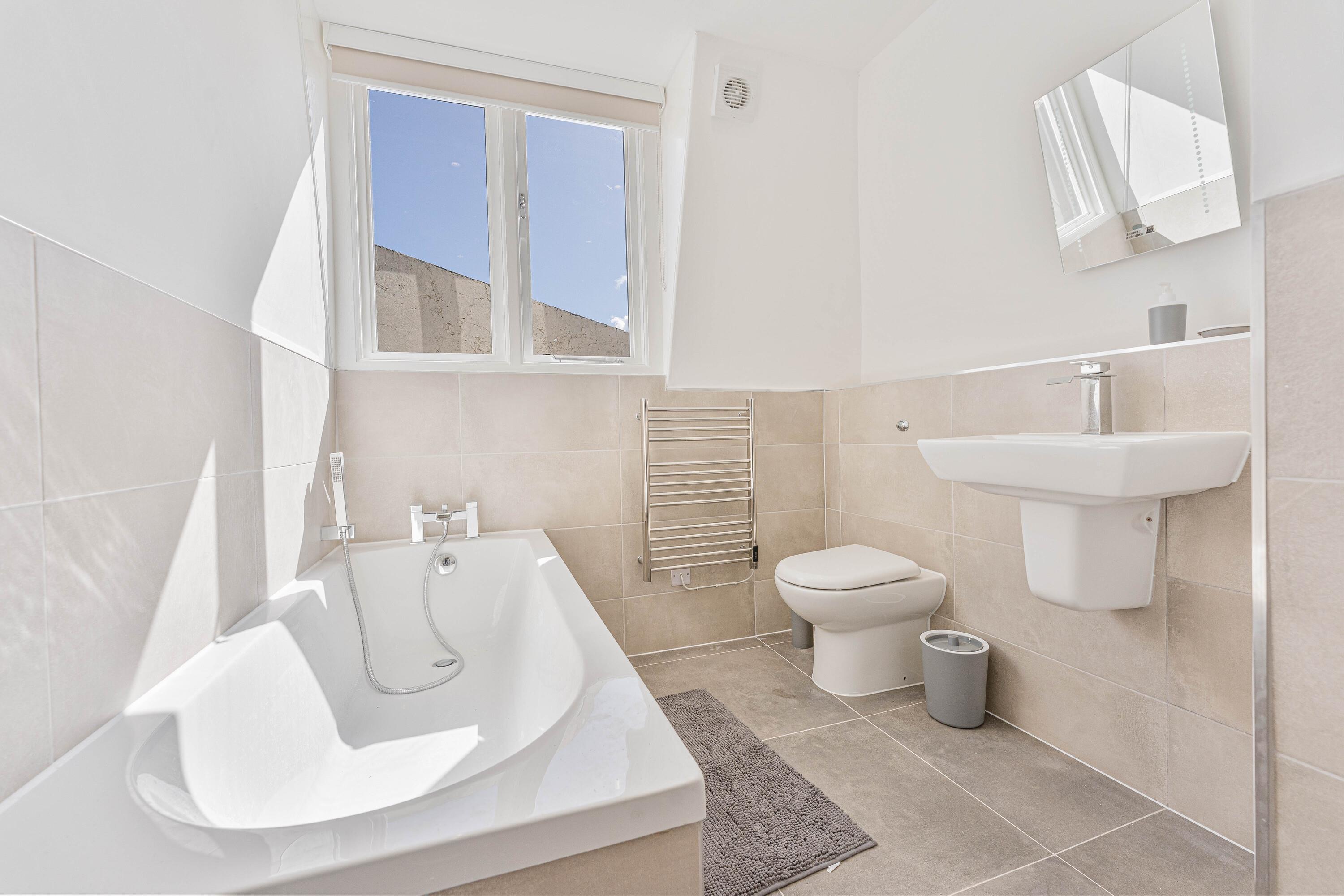 Unwind in the sleek bathroom, which includesa bathtub — ideal after a day exploring or working in town.