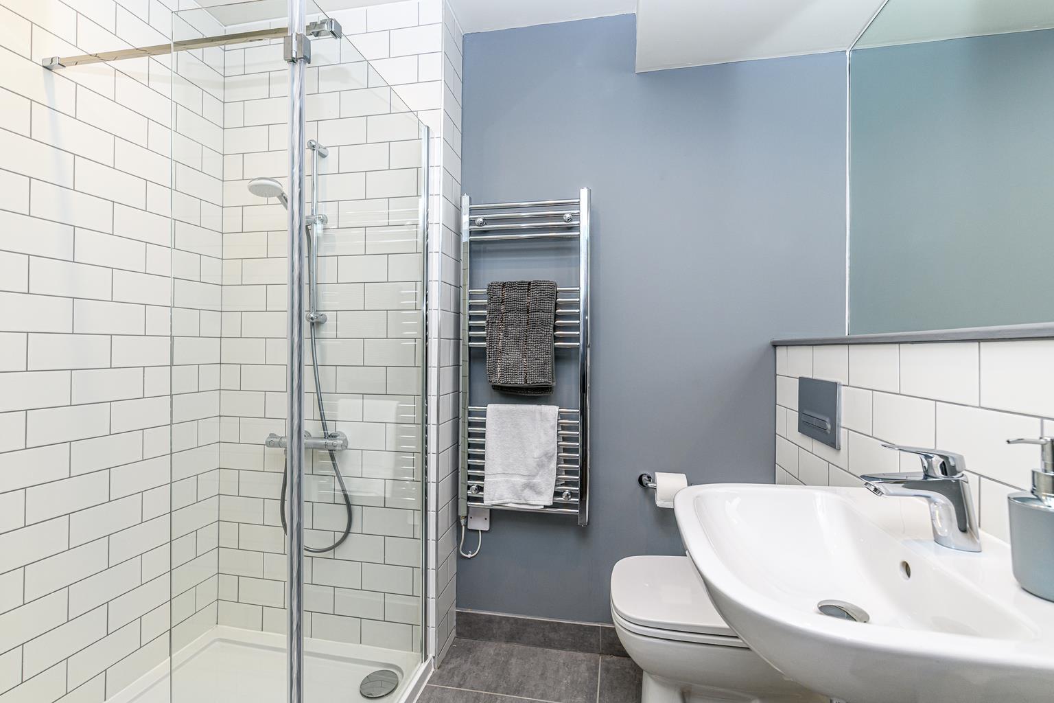 The bathroom includes a sleek walk-in shower, fresh towels, and all essentials provided.