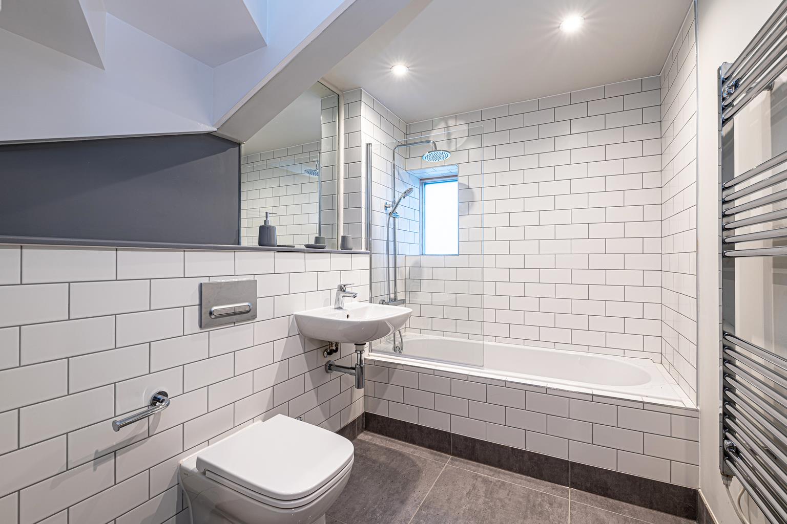 Relax in the sleek bathroom, complete with a full-size bathtub, modern fittings, and fresh towels provided for your stay.